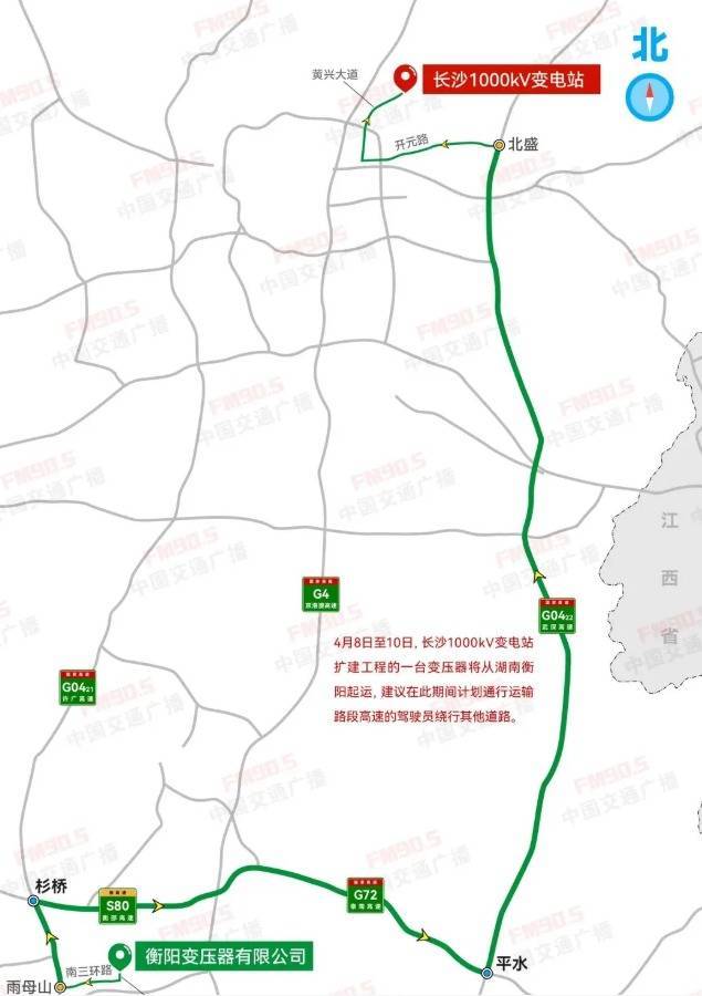 近日,长沙君从湖南省交通运输厅了解到,4月8日至10日,长沙1000kV变电站扩建工程的一台变压器将从湖南衡阳起运,期间,沿线高速公路将根据运输时间采取相应的管制措施,建议在此期间计划通行运输路段高速的驾驶员绕行其他道路。